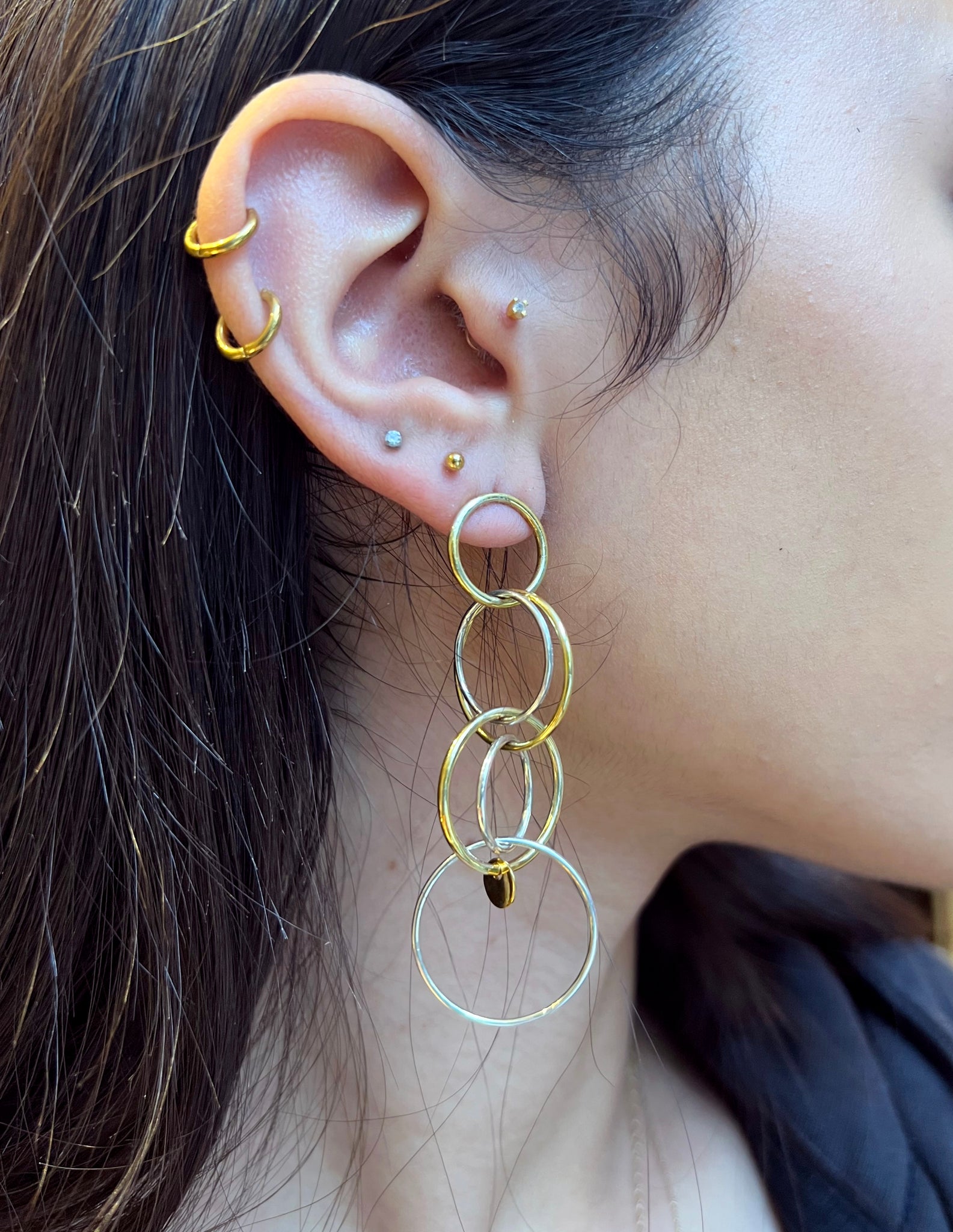 Set of sterling silver and yellow gold plated layered circles dangly stud earrings.